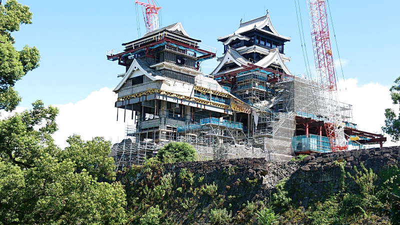 熊本城は骨組みを鉄骨像にしてしまうのですね、被せてしまえばわからないか、建物と石垣を同時進行が難しくしていますね。